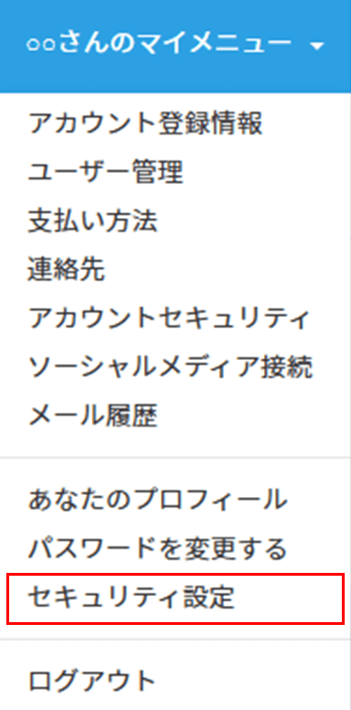 3.画面右上の「○○さんのマイメニュー」から「セキュリティ設定」をクリックします。