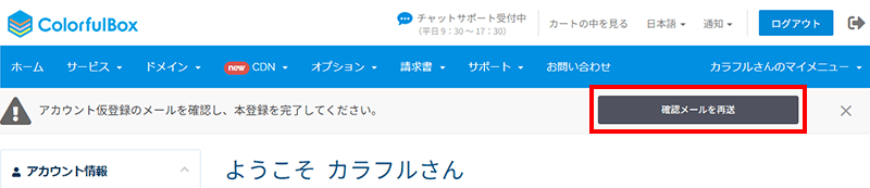 2.ページ上部にある「確認メールを再送」をクリックします。