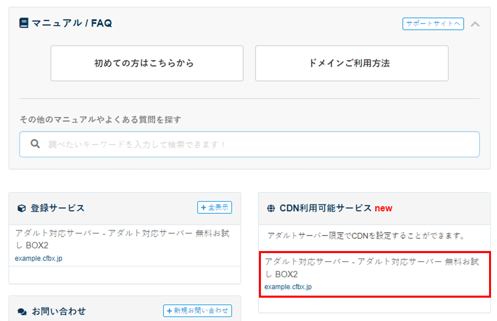 利用できるドメインはサーバーに登録済の独自ドメインとなります。設定が出来ていない場合は先にドメイン設定を行ってください。