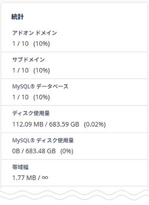 - ディスク使用量ディスクの使用量を表示しています。不足する場合は上位プランへのアップグレードをご検討下さい。